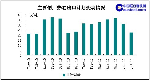 從目前國內外發展形勢來看,7-8月份出口市場仍不太看好,預計鋼材出口形勢好轉將有可能在三季度末也就是9月份以后體現。以熱卷為例,本網調查結果顯示,17家主流熱卷鋼廠7月計劃出口量為22.3萬噸,與上月相比減少了8.3萬噸,環比下降了27.1%,降幅比上月擴大10.9個百分點。